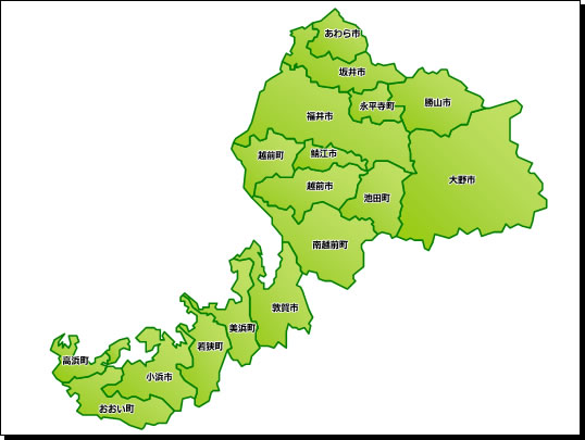 福井市|敦賀市|小浜市|大野市|勝山市|鯖江市|あわら市|越前市|坂井市|永平寺町|池田町|南越前町|越前町|美浜町|高浜町|おおい町|若狭町